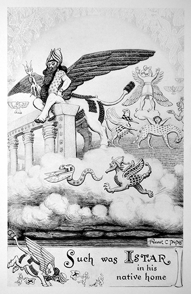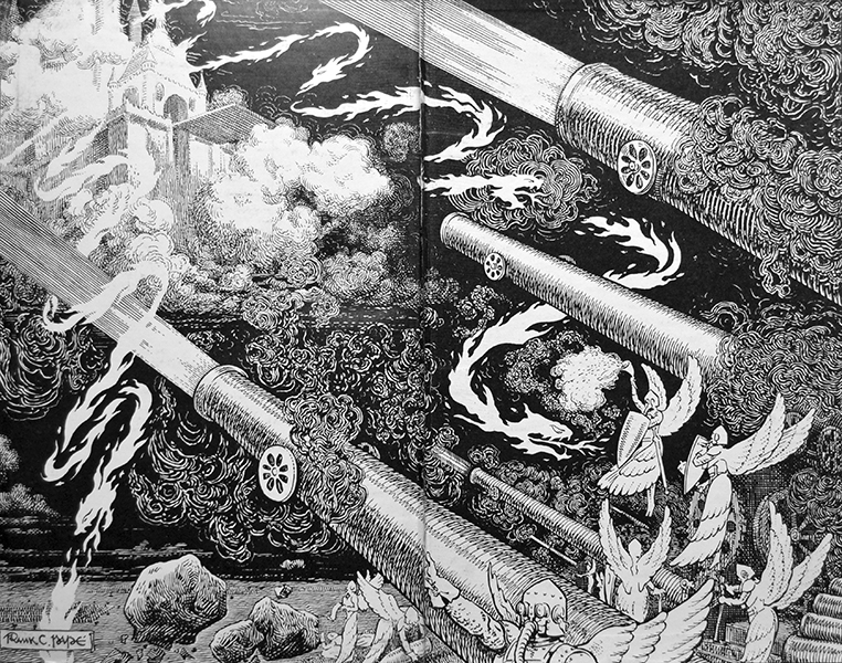 Quella tavola mi piacque così tanto perché la trovai audace, trattava le tematiche solenni del Simbolismo con stile ironico ma senza sminuirne la portata. Le motivazioni non sembravano essere riposte in una sfiducia causata dalla solita crisi dei valori, da un montare d’ateismo, dal riportare tutto sul piano materialista, bensì nel contribuire con un certo affetto alla cultura spirituale decadentista col valore aggiunto del sarcasmo. Credo che questo modus si riscontri anche nelle altre tavole, a partire dai bellissimi risguardi: non è meravigliosamente pomposo il modo di trattare la battaglia degli angeli che portano lo spadone al fianco come San Michele ma indossano anche le maschere antigas? E le nuvole, calligrafate all’inverosimile? E vogliamo parlare del frontespizio con quel titolo dai caratteri elettro-futuristi a contrasto con quelli pseudo-gotici con cui è riportato il nome dell’illustratore? Nello scontro tra quei due font così diversi c’è il dissidio interiore di chi conosce bene l’arte d’avanguardia ma ha deciso che per essere illustratori è necessario seguire, almeno nella forma, la tradizione. Si osservi a proposito il disegno con l’anziana coppia davanti al quadro espressionista; si intuisce da quanto vi si vede – e dalle poche lettere non occultate – che si tratta di un tema classico di derivazione evangelica “The prodigal son” (la cui versione più nota è quella di Rembrandt), eseguito alla maniera degli incisori del gruppo Die Brucke, come Schmidt-Rottluff. Al di là dell’immancabile ironia, qui espressa con la signora disegnata mentre si volta per distogliere lo sguardo dall’uomo nudo coprendosi con la falda del cappello (la cui piuma finisce così per censurare l’immagine all’intero pubblico dei lettori), una pensiero affiora: se la coppia è la metafora del pensiero borghese, magari un po’ stantio, quel figliolo ridotto in mezzo ai porci, seppur caparbiamente nuovo, non è forse il simbolo della deriva dell’arte? Scherza Papé, senza mancare di rispetto a nessuno. Non getta fango neanche sul tramontato e mai più proponibile politeismo, quando nella prima delle tavole fuori testo la figura cornuta di Pan fugge abbandonando un tempio in rovina; è scacciata/schiacciata dagli emblemi dei quattro evangelisti insolitamente agguerriti. Nella corsa è inseguito da serpenti volanti e perde il flauto. L’immagine non è solo una buffa rappresentazione del trionfo del Cristianesimo ma anche una altrettanto buffa, e dunque non definitiva, sconfitta del male, personificato dalla lussuriosa divinità pagana che ha fornito le caratteristiche per l’iconografia cristiana del diavolo. Se non ne siete convinti osservate l’ingrandimento dello sfondo del disegno: il movimento dell’aria è composta da una miriade di nere fiammelle con volto luciferino. In un’altra tavola il Dio-toro Istar incrocia le zampe a ridosso di un tempio come farebbe un ragazzo seduto su di un cornicione, mentre nella confusione generale del rincorrersi di divinità, dei putti si divertono ad improvvisare una corrida con Istar stesso. Stavolta sullo sfondo appaiono degli angeli eseguiti in negativo, quasi in filigrana (si veda ancora l’ingrandimento) un lavoro di bianco su grigio di incredibile raffinatezza. Quel cesello da orafo è riscontrabile in ogni tavola ed è il mezzo con cui si arriva al nero pieno attraverso tutti i grigi possibili; nel disegno intitolato “I sang to the shepherds and the nymphs of the birth of the world” le figure sono rese con neri nitidi in primo piano e si stemperano man mano che si allontanano (con evidenti richiami ad Apollo e Dafne di Bernini ed Amore e Psiche di Canova). La padronanza tecnica consente all’artista di differenziare i personaggi umani e gli ambienti terreni, ben marcati, da quelli ultraterreni, evanescenti (bellissimo il contrasto tra l’angelo diafano che si è infilato l’aureola nel polso ed i libri scurissimi che poggiano sulla sua testa). Altra costante è la presenza di un cartiglio, al di sotto di ogni tavola fuori testo, che dovrebbe avere la funzione di ricondurre il disegno ad una frase del testo e diventa di fatto un’ulteriore illustrazione, compendio di quella principale. C’è veramente da divertirsi nel vedere le operazioni – non tutte narrate nel testo – in cui sono intenti angeli molto umani, spesso accoppiati a donnine squisitamente art-decò, ancora vestite eppure dalle movenze erotiche, somiglianti a quelle che Renzo Ventura dipingeva negli stessi anni in Italia. Tecnicamente meno elaborati ma altrettanto affascinanti sono i disegni al tratto dei finalini: l’angelo col mal di pancia per aver mangiato il frutto dell’albero della conoscenza, il frate che sta per essere scaraventato dalla cornata del satiro sulla stufa-automa che fa gli sberleffi, e l’immagine di chiusura, realizzata come un quadro appeso con una corda che si intreccia a formare le parole “The End”: vi si vedono France e Papé che affrontano un tribunale stile inquisizione, l’uno maestoso ed imperturbabile e l’altro tremante che cerca riparo alle spalle del mentore. Ad attenderli vi sono una macchina della tortura ed un cappio.