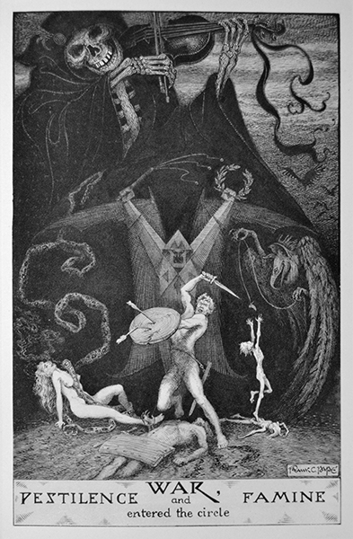 L’illustratore inglese Frank Cheyne Papé (nato a Camberwell 1878 e morto a Bedford 1972) è per l’appunto il frutto di una di queste ricerche effettuate on-line anni fa ed originariamente indirizzate verso altre mete. Il libro che prenderò in esame in questa sede è quello con cui il disegnatore mi si presentò la prima volta, The Revolt of the Angels di Anatole France, a partire da una tavola splendida con i cavalieri dell’Apocalisse, tanto magnetica che capita di reperire il volume in questione privo di quell’illustrazione poiché il precedente proprietario ha ben pensato di tagliarla via per incorniciarla (la qual cosa testimonierebbe pure buon gusto se non fosse per la barbarie perpetrata ai danni del libro). In grado di trasmigrare il gusto simbolista nel contesto ironico degli scritti di France e traducendo il tutto con un segno ad inchiostro dettagliato come quello d’un disegnatore di fumetti, Papé con una sola immagine riuscì a farsi spazio nel mio cuore ingolfato da amori giovanili strabordanti e nuove passioni più meditate e consapevoli. In quella tavola mi sembrò di vedere i grandi enigmi di Franz Von Stuck ed Arnold Boecklin tradotti a china per un ignoto fruitore del futuro, fanatico di Poe ma anche lettore di Metal Hurlant, quale io ero stato in gioventù. Era come se quella immagine fosse stata fatta per me, ma né io e né l’autore lo sapevamo. Viaggiando nel tempo per tanti anni l’immagine spedita giungeva finalmente a destinazione. Non saprei interpretare fino in fondo le figure di quel disegno: i quattro cavalieri dell’Apocalisse sembrano aumentare di numero, sfumano uno nell’altro e si scambiano i ruoli. La peste, tutt’altro che corrosione del morbo, è una bella ragazza ma è avvolta dalle spire d’un rettile che sembra un budello, più disgusto che veleno, e sta per soggiacere alle incomprensibili lusinghe del mostro. Ma allora è la peste o piuttosto la lussuria? Sulla sinistra la fame, questa sì inequivocabile, sdoppiata nella prima figura di un corpo secco come uno spaventapasseri – che annaspa implorante verso la misera esca – e nella seconda figura del mostro rapace derivato dalla pittura di Grunewald (Le tentazioni di Sant’Antonio). Insomma la fame come effetto e come causa personificata. Della guerra si mostrano tre facce, a partire sempre dalle conseguenze, drammaticamente sdraiate a terra, per proseguire con la figura della furia, natura bestiale, inevitabile mutazione dell’uomo in belva armata ed ispirata dalla terza entità, squadrata ad indicare un rivestimento metallico, più carro armato che corazza, con lo scudiscio in un pugno e l’ambìto alloro della vittoria nell’altro. E le ali piumate, caratteristiche della Nike, sono qui ali membranose da volo notturno di pipistrello. “War pestilence and famine entered circle” è riportato sotto al disegno (“and Death, tearing the violin from the fiddler’s hands, led the dance” è il seguito della frase di France stampata nella pagina successiva) ed in effetti le figure sono disposte circolarmente. Al di sopra di tutto la Morte, ammantata ed intenta a suonare un violino corredato di svolazzanti nastri neri. La materia delle ossa è disegnata con un arabesco di segni che rende bene l’invecchiamento, segni lasciati da un tempo infinito che scava teschio e falangi come l’acqua erode la pietra. Il volto della Morte potrebbe essere fatto della roccia del Gran Canyon.