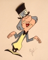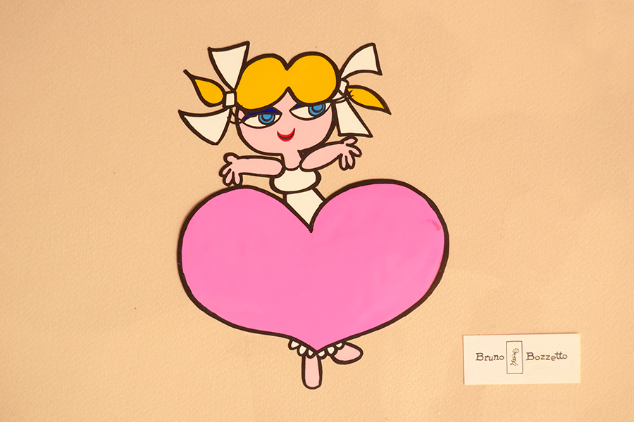 In questa sede vengono mostrati tre celluloidi originali di Carosello. Il primo viene dallo studio di Bruno Bozzetto, di cui riporta incollato un cartellino che funziona come marchio di fabbrica. Non si tratta di una vera firma, in quanto questi disegni definitivi, come già rilevato in altre occasioni, raramente venivano eseguiti dall’artista capo (il quale creava i personaggi e poi supervisionava il lavoro) e seguivano una sorta di catena di montaggio in cui le fasi del lavoro erano divise tra molti disegnatori, ognuno dei quali specializzato in una mansione. Bozzetto è una personalità che non richiede presentazione, piuttosto è interessante rivelare chi sia il personaggio disegnato; chi dispone di un sistema immunitario forte pur avendo avuto in tenera età un contatto visivo potrebbe non essere stato contagiato dal famoso morbo collezionistico e non ricordarsi il nome della signorina in questione: trattasi di Donna Rosa, testimonial per un carosello del 1965 delle caramelle Mental bianco ; l’opera è particolarmente interessante in quanto è un disegno per un fotogramma chiave di tutto il balletto dello spot, con la figura intera e di grandi dimensioni. Immagini “totali” come questa sono molto più ricercate di quelle che mostrano soggetti in inquadrature parziali o viste poco significative come può essere quella da dietro, magari determinante nell’economia del cartone animato ma poco appetibile se estratta dallo stesso e posta in una collezione. Il tratto grafico, morbido e duttile è in perfetta sintonia con l’immaginario collettivo della caramella. La fotografia che segue in sequenza la prima è relativa ad un disegno del medesimo balletto che arriva pochi istanti dopo, tanto che facendoli scorrere velocemente uno dietro l’altro si ricrea l’illusione del movimento.