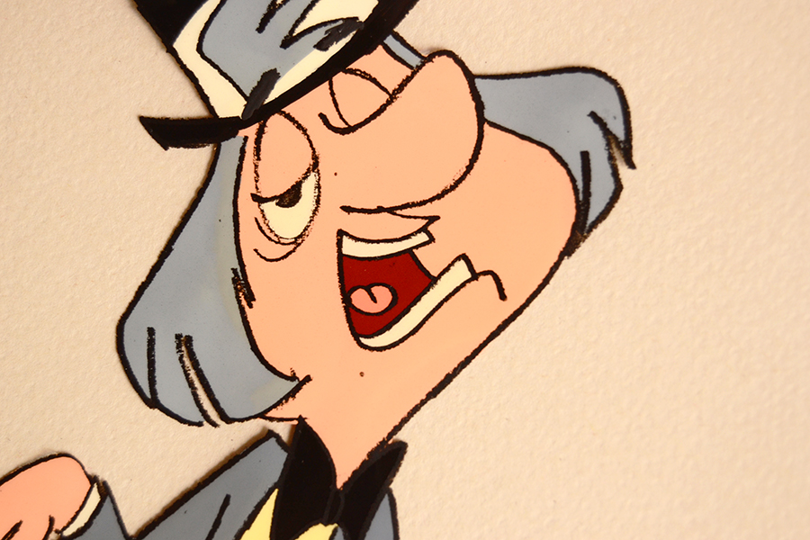 Ecco, confessato con la giustificazione della malattia il peccato di superficialità consumistica, procediamo con il perpetrarlo nell’approfondimento del discorso; in un cartone animato i disegni finali (2) debbono essere trasferiti dalla carta ad un supporto trasparente chiamato in vari modi, celluloide, da cui il diminutivo cel, acetato, lucido, rodovetro. Quest’ultimo vocabolo venne coniato dai fratelli Pagot – quelli di Calimero per intenderci – per indicare il materiale prodotto proprio da una delle ditte per le quali venivano creati degli spot, la Rhodia, (che era situata a Rho e produceva il rhodoid) da cui derivò appunto “rodovetro”, eliminando l’acca da quel posizionamento così poco consono nella lingua italiana. L’operazione avveniva tramite ricalco del disegno originale, successivamente ben ripassato in nero e poi colorato a campiture quasi sempre piatte per semplificare il lavoro. I contorni dovevano essere effettuati per primi poiché i colori non dovevano mai coprirli, neanche parzialmente, pena la leggibilità del disegno. Dunque tutte le operazioni erano eseguite sul retro del foglio trasparente mentre la faccia che veniva mostrata nel cartone animato era quella lucida e perfettamente liscia. Per evitare di invertire la destra con la sinistra si ribaltavano sul tavolo luminoso i fogli con i disegni originali, sempre di grammatura leggera e atti a far passare la luce, ecco dunque che il ricalco risultava corretto. Per quanto riguarda la tipologia dei colori usati sappiamo che dopo un breve arco di tempo in cui in gli Americani dipinsero i celluloidi a tempera ( poi mescolandoli con le colle viniliche per irrobustirli ) si passò agli acrilici, più tenaci ed elastici, e la tecnica divenne definitiva. Nelle produzioni italiane è frequente che i disegni su rodovetro siano in tonalità di grigio, poiché la destinazione era quella televisiva in un epoca in cui le trasmissioni erano in bianco e nero. In questo modo la modulazione dei toni era più diretta e l’effetto già visibile senza sorprese finali. Quando i rodovetri sono a colori è probabile che siano stati realizzati per spot che sarebbero giunti anche nelle sale cinematografiche. Capita che questi disegni non siano stati conservati in condizioni ottimali (ovvero basse temperature e umidità costante, non superiore al 50%) dunque risultano bombati a causa di un calore eccessivo o addirittura raggrinziti per l’emissione di acido acetico. Inoltre, per quanto l’acrilico sia un materiale duraturo, è frequente che i celluloidi siano parzialmente rovinati da distacco o caduta di colore; se la lacuna è marginale e di piccole dimensioni si può effettuare un intervento di integrazione ritoccando il disegno sul retro dopo aver ricreato la tinta necessaria. Se invece la perdita è vasta si può procedere in questo modo: si delimita un’area corrispondente a quella da riparare ma un po’ più estesa su di un nuovo foglio di acetato. La si dipinge del colore giusto e si sovrappone il rodovetro originario a quello nuovo facendoli corrispondere.