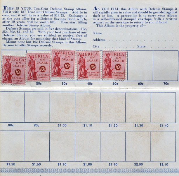 Nel difficile periodo della seconda guerra mondiale il governo americano invitò la popolazione ad acquistare “war bounds”, ovvero titoli di guerra, i cui proventi sarebbero stati destinati alla causa bellica. Con ottima mossa propagandistica il primo americano ad acquistarli fu il presidente Roosvelt. Casa Disney contribuì con un’idea rivolta a sensibilizzare i bambini all’idea del sacrificio economico ma ovviamente chi avrebbe aperto il portafoglio sarebbero stati i genitori. Così nel 1942, affidandosi alla nota casa editrice Random House, tutti i personaggi Disney si trovarono riuniti in una singolare avventura in un libro, verosimilmente distribuito gratis, a cui era allegato l’album per raccogliere dei piccoli bond da dieci centesimi in formato francobollo con l’effige della Guardia Nazionale, per un totale di 18 dollari e 75 pens, che potevano essere convertiti in un bond da 25 dollari consegnandoli in qualunque ufficio postale. Il governo americano si impegnava a restituire la somma al proprietario a distanza di dieci anni. Per stimolare ulteriormente i bambini il primo francobollo era già incollato nell’album.