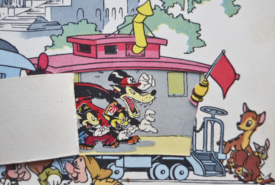 La storia ha inizio con la sosta del trenino Casey Junior (omaggio all’eroico ingegnere americano Casey Jones, morto nel 1900 in un drammatico incidente ferroviario nel tentativo di salvare la vita ad alcuni passeggeri), da cui scende il patriottico corteo composto da Topolino col fido Pluto, Paperino ed i suoi tre nipoti (all’epoca non avevano ancora assunto le prodighe spoglie delle giovani marmotte, erano tre discoli la cui energia poteva essere incanalata nella giusta direzione, e cioè contro il nemico) Pippo (tonto sì, ma volonteroso), Orazio, la gallinella saggia, Minnie (in altre immagini di propaganda vestirà i panni della Crocerossina), Biancaneve (prototipo di mamma con tutti i sette nani-figli), i tre porcellini, Pinocchio (che ha convinto perfino l’indomito e menefreghista Lucignolo), il grillo parlante (è stato sempre la buona coscienza, figuriamoci se si poteva macchiare d’assenteismo), Penna Bianca (di fronte allo straniero nemico anche i poveri indiani sono solidali coi visi pallidi), il dragone reclutante (pure lui!), e Dumbo (con Timoteo e le gazze), che uscito cinematograficamente nel 1941 è l’ultima star dell’epoca ed infatti gli viene riservato un ruolo di spicco. Manca Bambi, protagonista del film ancora in lavorazione, sostituito però da uno dei cerbiatti di Biancaneve. Alcuni di questi personaggi, non presenti all’interno del libro sono stati aggiunti in copertina, probabilmente con un’operazione di ripensamento ( una delle figure più simpatiche è l’ex-monello Lucignolo che sventola un cartello con il gioco di parole “Stamp ‘em out” – dove il sostantivo “stamp” cioè francobollo, diventa un esortativo “calciamoli fuori”- , rivelando di conservare ancora parte della sua originaria arroganza) (*). Mentre i prodi cartoni inneggiano alla vittoria tramite l’acquisto di bonds, all’interno dell’ultimo vagone blindato si sta commettendo il misfatto; per accorgercene dobbiamo aprire la finestrella corrispondente, dietro alla quale compare un forziere: tirando la linguetta si scoprono tre loschi individui che alzano le zampe sulla cassa. Trattasi di Ezechiele lupo e due dei suoi lupetti (figli o nipoti a seconda delle circostanze) acconciati però in questo modo: sul cilindro di papà lupo campeggia la svastica, mentre i cuccioli hanno l’uno un fez col fascio, l’altro, col muso giallo e gli occhiali, un copricapo da alto ufficiale con il sol levante. La metafora è fortissima e molto azzeccata. La Disney riuscì non solo a dare una giusta connotazione bellica ai suoi personaggi positivi ma anche a sfruttare la negatività di quelli cattivi come incarnazione del nemico. E’ noto che la potenza della caratterizzazione dei personaggi malvagi dell’universo Disney supera spesso quella dei personaggi buoni. In questo caso i tre cattivi sono veramente indimenticabili. E pensare che in Italia il lupo Ezechiele non aveva ancora questo nome buffo ed umanizzante ed era sempre accompagnato dall’aggettivo “mannaro”. Date le circostanze il libro non fu mai tradotto né edito fuori d’America e le forze del cosiddetto “Asse” non ebbero l’occasione di vederlo. Ma l’idea vincente fu quella di cercare per tre nemici tanto cattivi un degno eroe in grado di sconfiggerli, ed identificare in lui il più sfortunato dei beniamini, Paperino. La scelta ovvia sarebbe stata optare per Topolino; sebbene nato scavezzacollo, il topo era già stato riplasmato da Floyd Goffredson con le caratteristiche dell’ardimento del pioniere e dell’intelligenza dell’investigatore, dunque un eroe sperimentato ed amato. Ma trasformare l’iracondo, dispettoso, pasticcione e spesso incapace Paperino in colui che può sconfiggere il nazismo voleva dire che anche l’ultimo degli Americani poteva portare il suo contributo alla vittoria. Memore di questo successo il papero l’anno successivo se la dovette vedere direttamente con Hitler nel cartone Der Fuehrer’s Face, premiato con l’Oscar, diventato una delle sue interpretazioni più celebri e tuttora ufficialmente inedito in Italia.