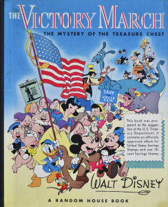 E’ noto che negli anni Trenta la Disney mandò alle stampe quattro spettacolari pop-up dedicati alla sua amata coppia di topi ed uno, più bello ancora, con alcuni personaggi delle Silly Symphonies. Nonostante la bellezza di questi volumetti il libro animato più interessante dal punto di vista storico è senza dubbio The Victory March – The mystery of the treasure chest, giunto un decennio più tardi, non proprio un pop-up (la festosità del quale non si confà all’austerità della guerra), piuttosto un mechanical-book.