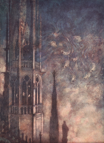 L’illustratore francese Edmond Dulac, che lavorava a Londra per l’editore Hodder and Stoughton ricevette all’inizio del Novecento l’incarico di trasporre in immagini le poesie di Poe, tra cui le celeberrime The Bells e The Raven. Si trattava veramente di una impresa ostica, Poe era considerato un apice anche in Europa grazie alla critica entusiasta di Baudelaire, Dulac aveva allora trent’anni ed era costantemente sottoposto al confronto con il fenomenale Rackham; inoltre arrischiarsi con la poesia equivaleva a camminare sul filo del rasoio.