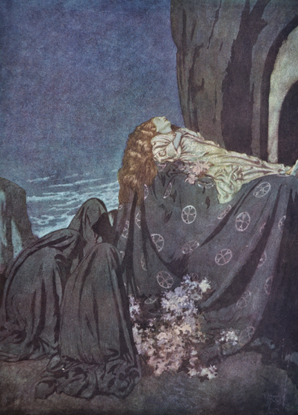 Eppure Dulac realizzò quella che credo essere è la più lirica delle interpretazioni di Poe. I suoi acquerelli evocano laddove le chine di Rackham per Poe’s Tales of Mistery and Imagination imponevano, sfumano dove Rackam contornava. Le linee del disegno tendono a scomparire sommerse dal colore; ed in questo sta forse la differenza più evidente tra i due, l’inglese elabora un disegno raffinatissimo che prevarica su tavolozze pressoché monocromatiche, il francese pur usando un disegno altrettanto elegante lo scardina con l’accensione di cromie – allora mai viste nei libri – dove baluginano dei blu da maiolica di moschea ( la passione di Dulac per l’Oriente si era già manifestata con le tavole per Le mille ed una notte ed aveva trovato piena soddisfazione in quelle per Rubaiyat of Omar Khayamm ). Negli occhielli, dove la tecnica è costituita dal solo disegno al tratto, il chiaroscuro dato dall’incrocio dei segni crea di nuovo massa che annulla il contorno. Prevale una lettura di Poe commossa e triste, l’orrore è marginale, il decadentismo si imparenta con suggestioni sia neoclassiche che romantiche. Sembra che Dulac abbia davanti agli occhi L’isola dei Morti di Arnold Boecklin ma anche i marmi di Antonio Canova. Quando giunge alla rappresentazione della morte, passaggio obbligato – e forse anche desiderato – di ogni illustratore di Poe, continua ad occultare con macchie come pozzi senza fondo dove l’acquerello lascia appena intuire schegge di infinito. Rackham ebbe a dire del suo incontro con Poe qualcosa che tradotto liberamente dall’Inglese suona come “le illustrazioni erano così terrificanti che iniziai a spaventarmi da solo”. E forse per esorcizzare questi malcelati brividi devia Poe in una caratterizzazione ironica, con raffigurazioni della morte che assomigliano ad alcuni fumetti francesi degli anni Settanta, peraltro molto belli ma lontani dalle malinconie macabre del poeta. In altre immagini rivela una certa fretta risolutiva, evidentemente disturbato dalle circostanze in cui si trova faticosamente calato e desideroso di far ritorno agli allegri folletti del folklore inglese. Dulac lascia invece intatta al poeta la sua lugubre solennità: dalle illustrazioni si ricava una sorta di “poetica del cappuccio e del mantello” in cui tutte le figure appaiono intabarrate svelando appena una mano scheletrica, una caviglia ossuta. Questi emissari del buio sono accoppiati a diafane fanciulle catalettiche, svenute, quando non già trapassate. Se è assente l’incappucciato la sua funzione è delegata al drappo-sipario che scende ad occultare, rendendo più simbolica la fine del dramma (The conqueror worm, The sleeper). Probabilmente l’illustratore conosceva il gruppo scultoreo per la tomba di Philippe Pot, impressionante capolavoro della fine del XV secolo conservato al Louvre. A quell’opera si ispira per molte illustrazioni, in particolare Lenore (*). In Eldorado l’entità paludata nel sudario-mantello ed il cavaliere non possono non risvegliare il ricordo delle figure della morte e del principe Prospero nella Maschera della morte rossa. Questa simbologia dell’ammanto viene unita alla raffigurazione di specchi d’acqua come luoghi della scomparsa e del dissolvimento liquido, non solo dell’uomo ma anche dell’architettura, dunque del mondo intero (si osservino The city in the sea e Fairyland). Memorabili restano le immagini per la poesia che dà il titolo al volume, con il re degli spettri arrampicato sulle campane come Hop Frog sul lampadario ma ancora più spaventoso ( e così Dulac batte tutti coloro che si sono cimentati con la novella ) e la sua sudditanza mutevole, ora minacciosa ora consolatoria, che si allunga e si ritira nelle altre tavole, fra le quali si piazza l’invenzione di quelle teste alate di sfinge-cherubino, mirabili per segno, colore, composizione, evocazione. Giunge anche il momento, con The Raven, di rappresentare lo stesso poeta; chiuso in sé, evidentemente meditabondo fino alla depressione, trattasi di un vero ritratto di Poe, forse uno dei più belli che gli siano stati fatti, vestito con gli abiti con cui venne immortalato in alcuni noti dagherrotipi. Nella stanza buia il busto di Atena finisce tagliato per metà fuori dall’inquadratura e l’attenzione si sposta su di un ritratto ovale, probabilmente quello reso celebre dall’omonimo racconto; in tal caso Dulac sovrappone la figura di Poe a quella del pittore protagonista e ribadisce la sua conoscenza ed ammirazione per Poe tout-court. Insomma, illustra la sua poesia facendo riferimenti continui alla sua prosa. A conferma il libro si chiude con l’illustrazione per Alone, in cui citando Caspar David Friedrick ed il suo Viandante sul mare di nebbia, Dulac visualizza l’amico di Roderick perso nella contemplazione sublime della catastrofe che ha causato la Caduta della casa degli Usher.