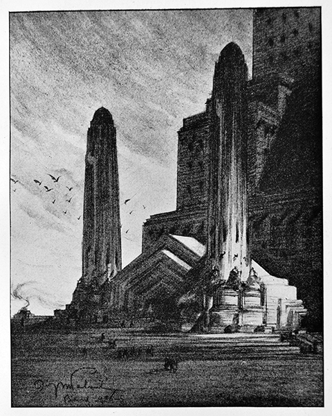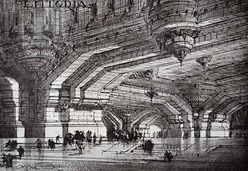 La narrazione a posteriori di quanti hanno vissuto l’epoca fascista, ma anche di quanti l’hanno solo immaginata, ha fossilizzato l’immagine di un ventennio monolitico piuttosto stolido, allergico all’innovazione, disattento alle differenze, tutto orientato alla retorica. Ma il discorso relativo alla politica non sempre corrisponde in modo pedissequo alla produzione artistico-culturale, anche quando vi sia un intreccio saldo tra i due aspetti. Taluni libri realizzati sotto il fascismo rivelano fantasia, arguzia e spirito avanguardistico, siano essi concepiti per lettori adulti oppure destinati ai più giovani. Il libro imbullonato Dinamo-Azari Depero Futurista ne è un esempio celebre, come pure i 92 volumi della Scala d’oro Utet, o I quattro moschettieri di Nizza, Morbelli e Bioletto, divenuti addirittura fenomeno di costume (1), ma si pensi anche ad opere meno note e più propagandistiche: il libro-documentazione Mostra della rivoluzione fascista del 1933, con la sua impaginazione modernissima, oppure il manuale Il capo squadra balilla del 1935, disegnato da Raoul Verdini -che pure non era un mostro di originalità- centrando l’intento di declinare per i bambini un Futurismo mal digerito dagli adulti, se pure appartenenti all’avanzata borghesia. Vi è poi un tanto curato quanto sconosciuto abecedario poetico intitolato Italia dall’A alla zeta, scritto Fraschetti ed illustrato Testi, che costituisce forse il capolavoro grafico dell’editoria di propaganda per bambini. E che dire dell’Almanacco anti-letterario del 1937, in cui spiccano Erberto Carboni e Bruno Munari, i quali trattano con ironia grafica ogni tematica proposta, senza tralasciare i discorsi del Duce né tantomeno la sua immagine? E sia chiaro che l’editore è Bompiani, dunque trattasi di una pubblicazione ufficiale, non del frutto clandestino di chissà quale controcultura (2). Il discorso meriterebbe spazi ben più approfonditi, a me serve per contestualizzare velocemente un’opera dimenticata e sorprendente, che sembra disegnata da uno scenografo cinematografico dei nostri giorni per un colossal affidato al più spettacolare dei registi. Dall’aspetto esteriore però non trapela nulla: L’Eternale Mole Littoria dell’architetto Mario Palanti è un libretto di piccole dimensioni, con copertina sobria in tela e fascio dorato stampato a secco. Insomma una delle “solite” opere mussoliniane con i motti e le firme all’apparenza calligrafiche ma in realtà riprodotte a stampa, i proclami (noiosi), le critiche entusiaste dei personaggi di spicco. In effetti il libro contempla anche tutto ciò ma quando giunge alle tavole (che avrebbero meritato un formato ben maggiore ed una stampa più raffinata) sbalordisce il lettore. Palanti, milanese dal gusto eclettico, vira la retorica fascista in chiave archeologico-fantascientifica, progettando un edificio che sembra riportato alla luce dopo il passare di ere lunghe e misteriose. Da anni si impone l’esigenza di un edificio romano che celebri il regime e lo rappresenti come “San Pietro il Cattolicesimo, l’Altare della Patria il Risorgimento (…)” poiché “vi è (nella gente) l’insopprimibile aspirazione che si manifesta nella frenesia delle passioni portate al massimo della saturazione, alla conquista della vetta, in ogni campo di azione. Dare a queste aspirazioni una meta di attrazione e di concentrazione, un fuoco che abbia tutti i requisiti della irresistibilità psicologica, del non plus ultra della grandiosità e della moda, è il mezzo più sicuro di capitalizzare la suggestione di Roma Signora del mondo”. Egli propone una costruzione che ignora le forme avanguardistiche dell’architettura e celebra un passato aureo in una commistione stilistica incredibile, non solo classica ma frutto anche dello studio dei templi induisti e buddisti, in primis quello di Angkor-Wat. Sono infatti gli edifici religiosi ad attrarre Palanti. Sebbene la Mole Littoria sia anche centro di potere politico essa deve configurarsi come luogo dell’esaltazione dello spirito, in anticipo su quella mistica fascista che avrebbe consacrato Evola come sacerdote massimo. Alcune tavole ben evidenziano l’ispirazione dalla moschea di Santa Sofia, aleggia un bizantinismo di arcate ed esedre ovunque seminate e se l’ascensione al divino si concretizza nello sviluppo verticale sono le molteplici cupole a suggerire le sfere degli empirei. Due caratteristiche appaiono determinanti in questo senso nei disegni dell’architetto; la prima è la presenza dell’acqua. Non solo quella del Tevere (e della sua importanza nell’origine mitologica della città), scavalcato da ponti che garantiscono l’accesso alla Mole, ma quella di grandi polle interne che appaiono inondare livelli sotterranei della costruzione. Questi specchi pieni di riflessi, disegnati con una certa ambiguità, potrebbero anche rappresentare pavimenti tirati a lucido ma evocano comunque la sacralità dell’elemento liquido, la sua necessità vitale, la ritualità del battesimo. Vi è un dannunzianesimo fortissimo, eppure il poeta è l’illustre assente tra i commentatori del libro. Forse l’assenza è giustificata: nell’anno precedente il Duce ed il Vate si erano incontrati al Vittoriale nella stanza del Mascheraio e gli aneddoti riportati in proposito confermano quanto il loro pensiero fosse divergente. La seconda caratteristica importante è l’illuminazione dal basso. Una luce endogena proveniente da una fonte ctonia spara le ombre verso i cieli e conferisce un’atmosfera magica ad interni ed esterni. Se si pensa che la prima edizione di Metropolis of tomorrow, in cui l’architetto Hugh Ferriss usa una analoga illuminazione dei grattacieli americani, è posteriore di tre anni, si capisce quanto il lavoro di Palanti risultasse personale. Retorico sì, eppure folgorante nella sua originalità. Come se le Carceri d’invenzione di Piranesi fossero state sottoposte ad un processo di razionalizzazione man