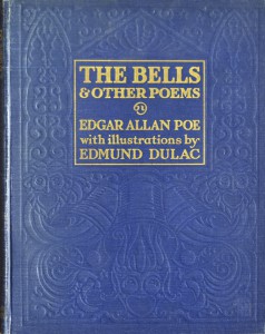 Edgar Allan Poe, The Bells & Other Poems – with illustrations by Edmond Dulac, edito da Hodder and Stoughton, 1912, copertina in percallina blu con titolo oro ed incisioni a secco arabescate col tema delle campane disegnato da Frank Hazen (siglata F H), specialista in design delle rilegature. Formato in quarto, 28 illustrazioni a colori stampate separatamente ed aggiunte come pagina intera, protette da veline col titolo della poesia; varie testatine in marrone scuro su fondo crema, pagine in carta forte non numerate. Cofanetto editoriale in cartoncino bianco.