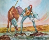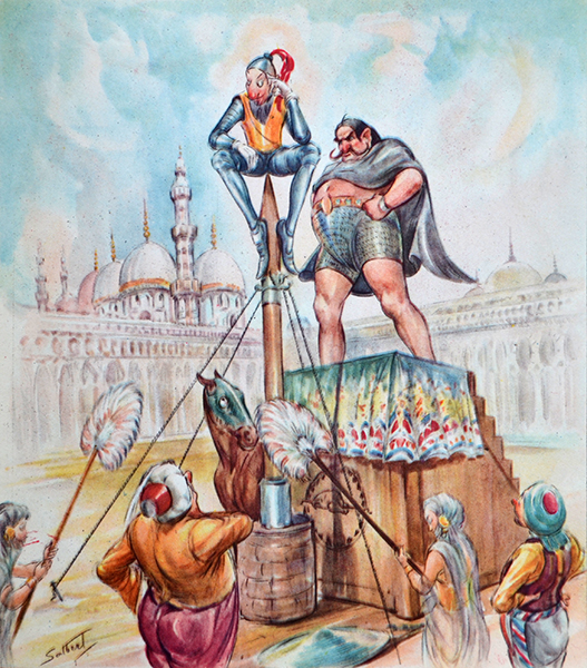 Ben compreso l’appeal sui giovani, i tanti editori hanno spesso richiesto il supporto di illustratori per visualizzare il prode Anselmo, mandando alle stampe versioni a volte opposte del personaggio: Livio Apolloni ne fa un tracagnotto fasciato di maglia ferrea, Aldo Mazza uno spilungone dal naso sporgente. Da questa ultima interpretazione deve aver preso spunto il misterioso Salbert, autore dell’edizione più bella eppure più ignorata, causa rarità, dell’operetta. Trattasi di quella in formato quadrotto delle Edizioni Cicogna, stampata senza data ma collocabile intorno all’immediato dopoguerra. In copertina il viso del prode Anselmo si accosta al muso del suo cavallo e lo spropositato naso a peperone del primo fa pendant all’anatomia allungata dell’equino. La similitudine è accentuata dalle protezioni metalliche indossate da entrambi. Al di sotto delle teste i foglietti di un calendario si perdono nel vento ad indicare il tempo che passa senza veder tornare il cavaliere. All’interno ogni quartina fronteggia una tavola ad acquerello in cui Salbert dimostra sicurezza d’esecuzione e conoscenze anatomiche approfondite nel tracciare uomini ed animali. La figura allampanata di Anselmo è di reminiscenza donchisciottesca e “la sua bella”, di cui ignoriamo il nome, rimanda ad una Dulcinea in versione castellana, anche lei fornita di un gran naso che spinge in direzione contraria a quello del fidanzato. Tra i due personaggi, anzi tre perché il cavallo ha un ruolo importantissimo nel servire e proteggere il padrone più di quanto farebbe un cane, c’è uno scambio di occhiate di intesa, una resa espressiva degna dello psicologo più raffinato, purtroppo inficiata da una stampa non ottimale, come succedeva nelle pubblicazioni dell’epoca, spesso quando a colori: le illustrazioni finiscono “fuori centro”, con l’effetto fastidioso del disegno sdoppiato. L’autore delle immagini rivela un’attenta conoscenza dell’operato dei colleghi dell’epoca; sa essere caricaturale ed allo stesso tempo realistico come Walter Molino (però il suo tratto è meno nervoso), ma anche plastico e sciolto come Libico Maraja (ma gli piace conservare la traccia del disegno intorno ai colori ed anche sotto di essi), ed osservando la rappresentazione dei sultani e degli scenari musulmani viene da pensare che anche lui abbia fatto parte della squadra impegnata nell’avventurosa realizzazione de La rosa di Bagdad (2). Le inquadrature ribassate lasciano abbondante spazio al cielo, le cui striature diventano fondamentali per evocare atmosfere diverse. Nelle ultime due illustrazioni l’aria si fa torrida e l’inseparabile coppia cavaliere/cavallo si accascia su se stessa rimpicciolendosi tra le sabbie. Però a fine poesia, a margine del testo stampato in caratteri gotici, una scritta “a mano” in rosso dichiara “Attenzione!! Avvertiamo che Anselmo viene miracolosamente salvato e ritorna. La vicenda è narrata ne Il ritorno del Crociato, illustrato da Salbert”. Così impariamo che, con buona pace di Giovanni Visconti Venosta e di tutti i suoi sforzi, la storia ha un seguito ufficiale, e il disegnatore ha quasi soppiantato l’autore dei versi. E questo Salbert deve avere una sua importanza perché nella pagina di chiusura del libro, quella con l’elenco delle pubblicazioni, quando si arriva ad elencare i volumi della “Piccola enciclopedia degli animali” si specifica che è “riccamente illustrata e descritta dal pittore Salbert”. Insomma, finché si tratta di soggetti grotteschi (cavalieri cristiani o musulmani che siano) Salbert è considerato illustratore, ma quando i soggetti diventano realistici (gli animali per una enciclopedia) allora può salire di rango e divenire pittore a tutti gli effetti.