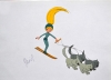 Il disegno del Signor Rossi è stato eseguito durante la realizzazione del cortometraggio a colori del 1971 Il signor Rossi al safari fotografico ed è ben rappresentativo del personaggio poiché lo coglie in un’espressione emblematica della sua caratterizzazione, prototipo del senso di inadeguatezza dell’uomo moderno di fronte alla realtà. Però è chiaro che nella durata del cartone animato su quel volto scorrono tutte le emozioni. Ed infatti sul retro del foglio si nota una linea leggera in corrispondenza della bocca che definisce un sorriso con tanto di angoli nelle guance. Non è una cancellatura, è la grafite lasciata dal disegno corrispondente al fotogramma precedente, in cui il personaggio era esattamente uguale, tranne appunto nella bocca. Anche un braccio che prima figurava in posizione orizzontale ha lasciato un segno analogo ma meno riconoscibile. Quando le veline si appoggiano l’una sull’altra per il ricalco parziale (2) spesso accade, se si usano matite grasse, che una traccia di queste si traferisca sul foglio superiore. In un’altra velina proveniente dal medesimo film ed in cui è disegnato un impiegato addetto al “visto” dei documenti il processo è ancora più evidente; le tracce lasciate dal braccio che scende inesorabile impugnando il timbro come un pugnale sono due. Si tratta sempre di riferimenti utili al disegnatore per tenere a registro le figure, e la loro leggerezza ai limiti della leggibilità non confonde chi dovrà poi eseguire la fase del ricalco su celluloide. E a proposito di quest’ultimo differenze interessanti si riscontrano confrontando un rodovetro di Gino Gavioli con uno di Paul Campani. Il primo risale al 1967 ed è materiale per Pallina – avventura al Polo, carosello per il detergente Vetril, ma anche per la cera da pavimenti Solex. Benché Gavioli abbia dichiarato trattarsi di una creazione a lui poco congeniale in quanto troppo femminile, fu un successo immediato ed indimenticabile. Era simpatica, discendeva da una schiatta di antenate bizzarre e ne seguiva le gesta avventurose uscendo dai pericoli con escamotage originali. Acquisì presto tridimensionalità sotto forma di bambola, sia di plastica (quattro versioni in base al colore della camicetta) che di panno, e divenne protagonista di albi illustrati. Le linee di contorno del disegno sono ottenute tramite fotocopia su lucido, con i vantaggi del caso già spiegati in articoli precedenti. Il riconoscimento di un segno eseguito a mano da uno fotocopiato non è sempre immediato: in questo caso oltre all’effetto di sgranatura, particolarmente evidente dove il disegno si assottiglia di più (le redini) o dove è eseguito con maggior velocità (i capelli) abbiamo anche uno sdoppiamento, per esempio intorno alle zampe dei cani. Quei puntini sono quanto resta della traccia di un’immagine sovrapposta (quelle tracce di cui parlavamo con i disegni signor Rossi) che si è trasferita, appena percettibile, anche in fotocopia. Sul lato superiore del rodovetro vi è dunque il rilievo dei contorni neri mentre sul retro si trova la sporgenza del colore, tempera stesa in modo corposo e piatto, più spesso acrilico. In questo modo le linee nere non vengono mai coperte e non c’è neanche il rischio di scioglierle o sbaffarle visto che non si trovano a contatto diretto con colori ed eventuali diluenti. La firma è autentica ma è stata posta in un secondo momento, e cioè quando si è deciso di immettere l’opera sul mercato. Credo che negli anni Sessanta nessun disegnatore di cartoni animati pubblicitari si aspettasse che di lì a poco si sarebbe sviluppato un collezionismo relativo, e questi disegni non solo non si fregiavano di firme ma venivano a volte cancellati per utilizzare nuovamente i materiali di supporto. Tali firme sono comunque da intendersi cumulative, un po’ come un regista firma un’opera cinematografica; sappiamo bene che un’immagine realizzata su acetato è il prodotto di un lavoro di squadra, che può, in quella configurazione, anche considerarsi definitivo ma in realtà giunge a completamento soltanto quando inserito nel film.